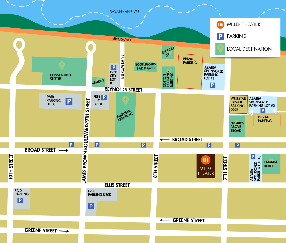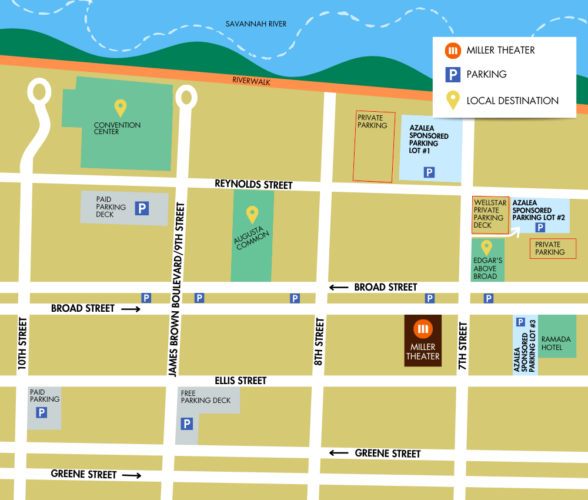 With permission from the Traffic Engineering Division of Augusta’s Engineering Department, on performance days, the parking well in front of the Miller Theater is reserved for those who have valid disabled person’s parking hang tags. Please contact the box office for further information.
